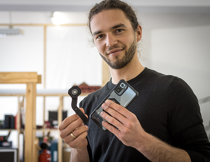 Denn richtig fest muss bei Simon Josenhans jedes Smartphone im Halter sitzen: „Ich bin begeisterter Radfahrer“, sagt der Maschinenbau-Student an der Technischen Hochschule Mittelhessen (THM). Allround-Gerät für Navigation, Fitnesstracking, Fotos und Telefonate, wollte er sein Smartphone bei Radtouren und sportlichen Ausfahrten nicht in der Hosentasche, sondern stets am Lenker haben. Ohne Gefahr zu laufen, es beim nächsten Schlagloch zu verlieren – oder es so festschrauben zu müssen, dass es für einen Schnappschuss nicht mal eben in die Hand genommen werden kann. „Die Massenware war nicht sportlich genug, unpraktisch, nicht schick und meistens ziemlich unsicher“, erklärt Josenhans, der so genügend Potenzial für eine Unternehmensgründung sah.