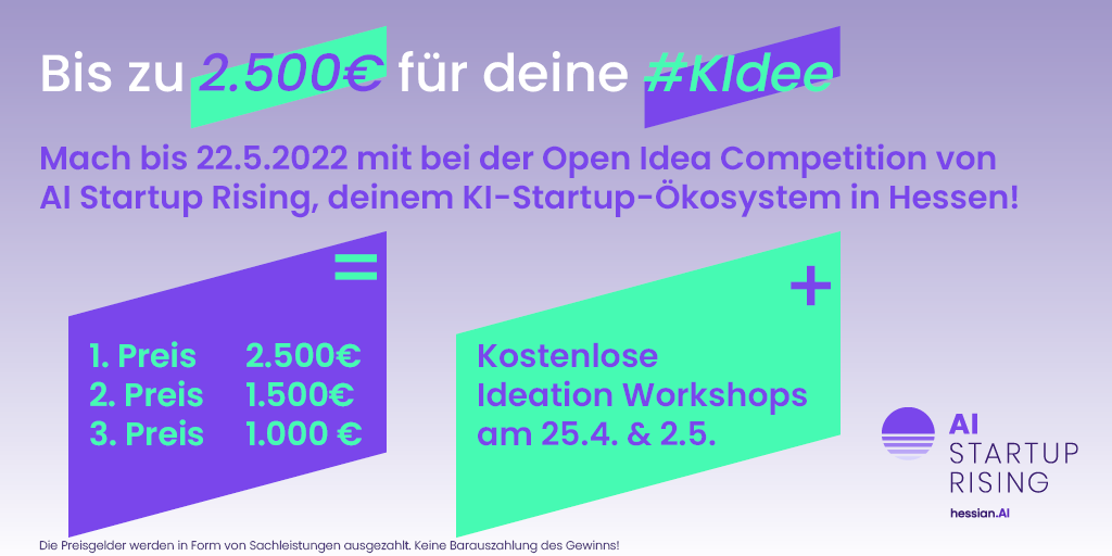Welches Problem würdest du gerne mit Künstlicher Intelligenz lösen? In deinem Kopf gründest du schon das nächste große KI-Startup? Gewinne bis zu 2.500€ für deine #KIdee - mach bis 22.5.2022 mit bei der Open Idea Competition von AI Startup Rising, deinem KI-Startup-Ökosystem in Hessen!